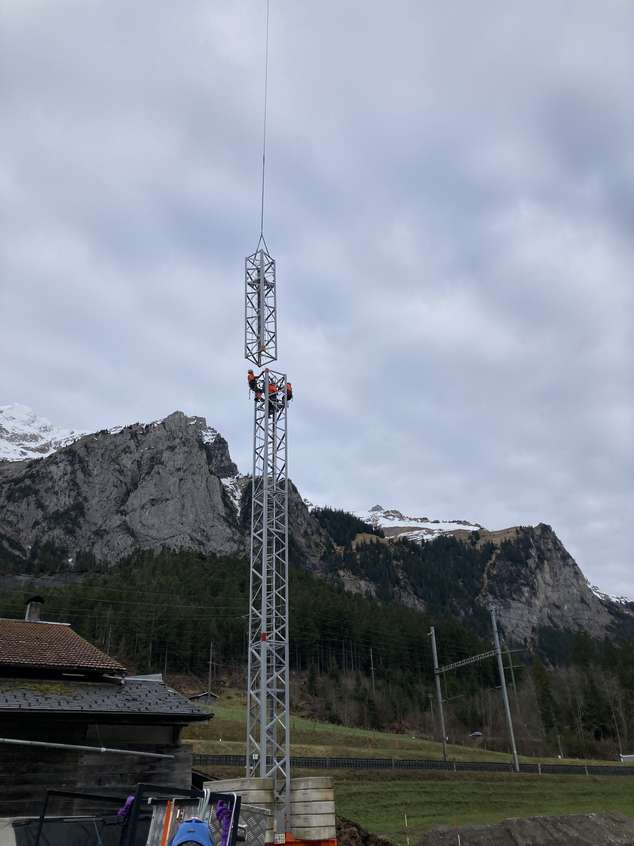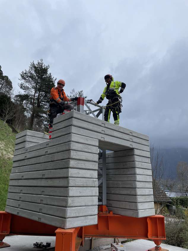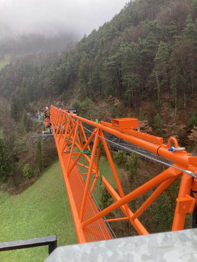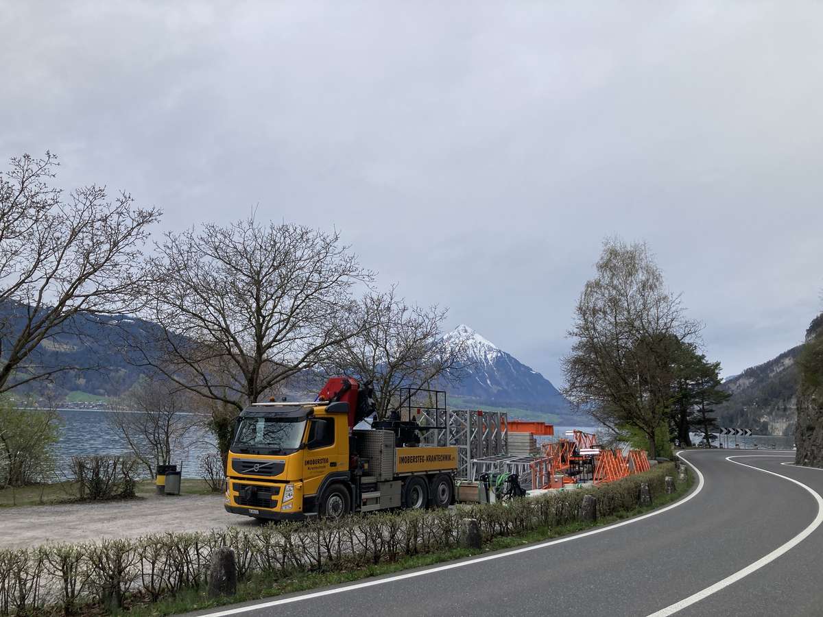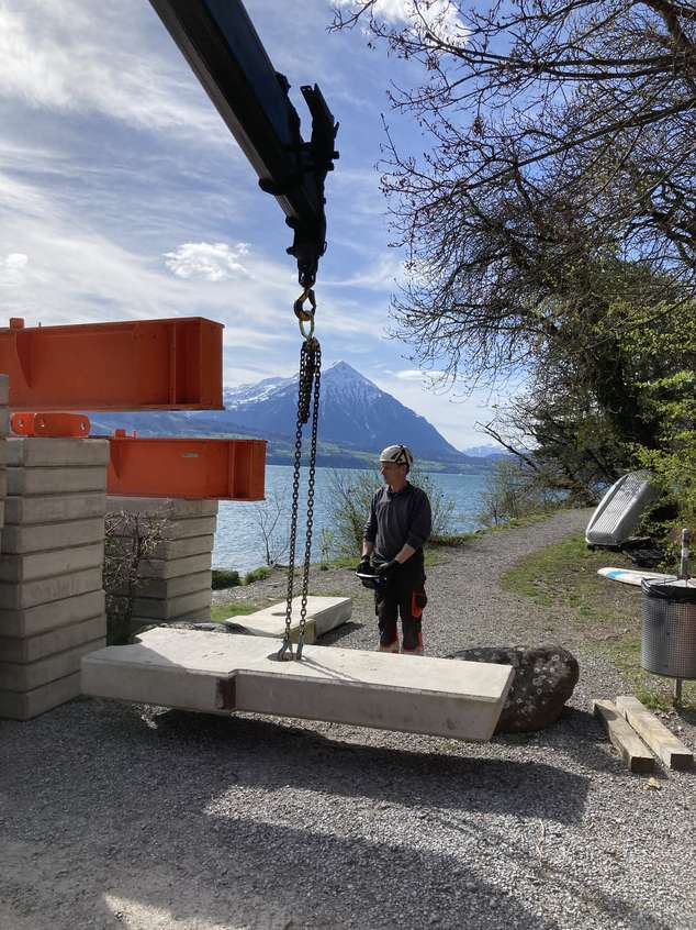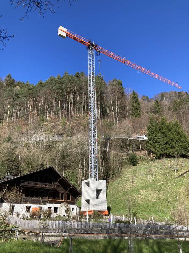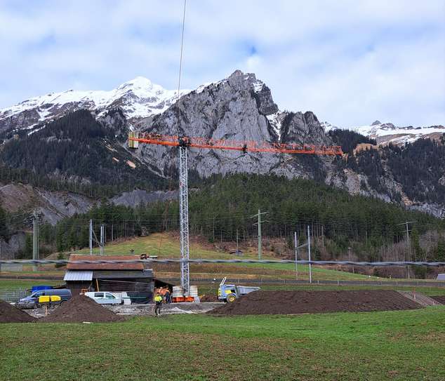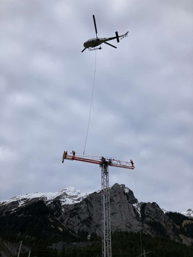 Für die Sanierung eines Hauses, das nur über den Thunersee oder einen Fußweg erreichbar ist, wurde der Kran auf eine Hakenhöhe von 35 Metern mittels eines Helikopters montiert. Dies ermöglicht eine effiziente und sichere Überführung von Baumaterialien und Ausrüstung vom 30 Meter höher gelegenen Parkplatz zur Baustelle.